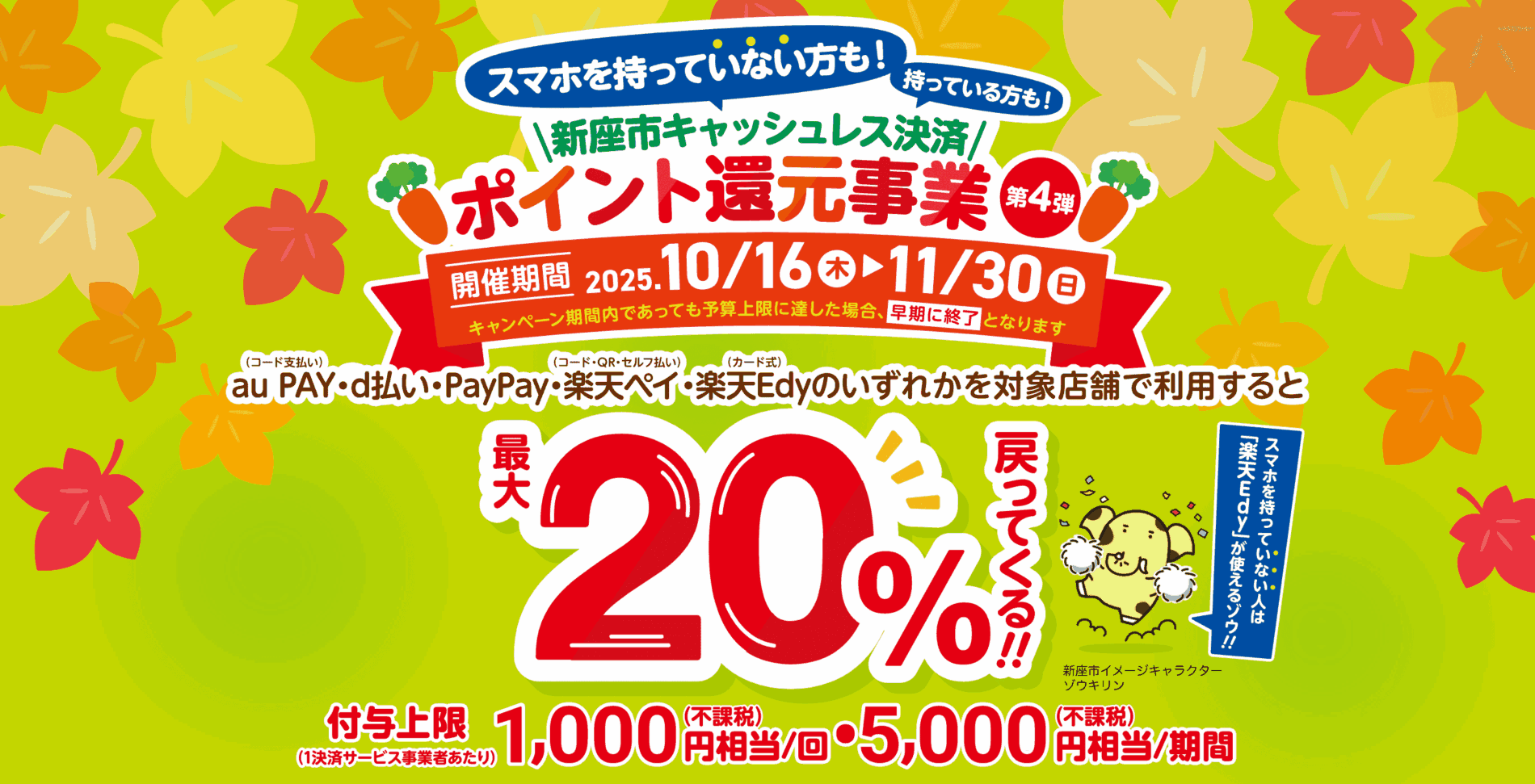 2025/11/17 / 最終更新日時 : 2025/11/17 takayuki 新着情報! 【11月23日をもって早期終了します】キャッシュレス決済で20%ポイント還元キャンペーン(第4弾) 現在開催中の「新座市キャッシュレス決済 ポイント還元事業 第4弾」について、予想を上回るご利用をいただき、キャンペーン特典の付与総額が予定していた上限の金額に達する見込みとなりましたため、2025年11月23日(日)午後 […]