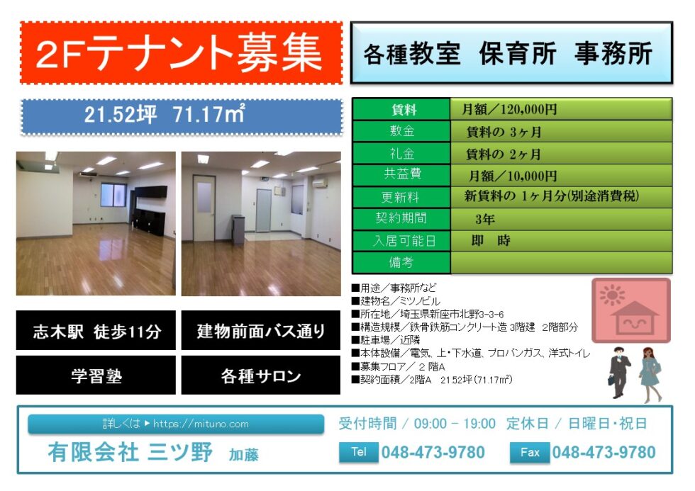 2024/06/04 / 最終更新日時 : 2025/10/15 takayuki 新着情報! 2Fテナント募集中! 貸店舗・空き店舗 各種教室 保育所 事務所 塾 ■用途/事務所など ■建物名/ミツノビル ■所在地/埼玉県新座市北野3-3-6 ■構造規模/鉄骨鉄筋コンクリート造 3階建 2階部分 ■駐車場/近隣 ■本体設備/電気、上・ […]