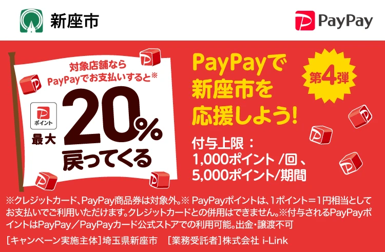 現在開催中の「新座市キャッシュレス決済 ポイント還元事業 第4弾」について、予想を上回るご利用をいただき、キャンペーン特典の付与総額が予定していた上限の金額に達する見込みとなりましたため、2025年11月23日(日)午後11時59分をもってキャンペーンを終了することとなりました。何卒ご理解のほどお願い申し上げます。